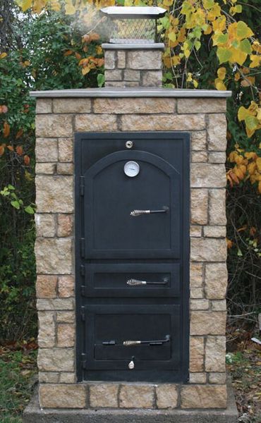 There is a vent over a brick stove top with a space to put wood below for heat. A brick pizza oven, which can be used as a normal oven. There is also a tandoor oven.